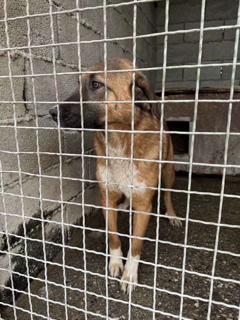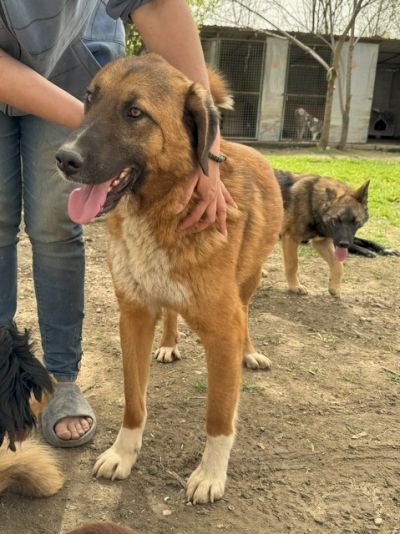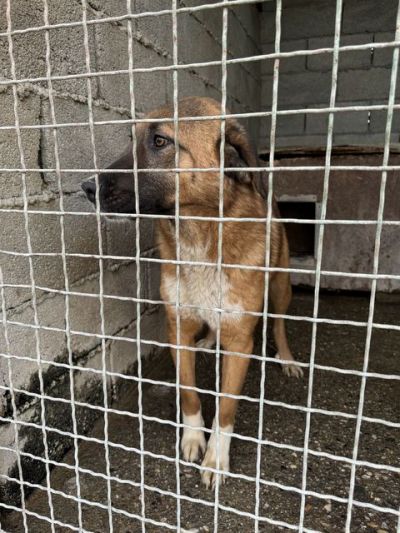 Er ist sanft zu Katzen und verträgt sich gut mit seinen Artgenossen, er teilt sich den engen Zwinger mit einem weiteren Hund.