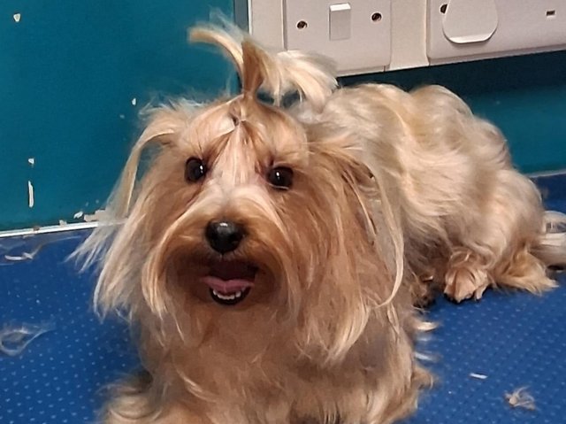 Während die Dame ihren Yorki-Freund Dandie eingefangen hatte