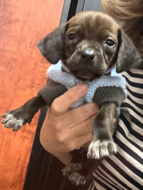 Diese entzückende Welpin trägt den Namen Joy und ist ein schokoladenbraunes Freudenbündel. Sie hat das weichste Fell und die süssesten, neugierigsten Augen. Sie hat einen zierlichen Körperbau, Hängeohren und einen sanften Blick, der Herzen sofort schmelzen lässt. Sie ist ein selbstbewusstes und verspieltes Welpenmädchen, das es liebt, seine Umgebung zu erkunden und mit Menschen in Kontakt zu treten. Trotz ihres jungen Alters läuft sie bereits gut an der Leine und ist nachts an die Transportbox gewöhnt.