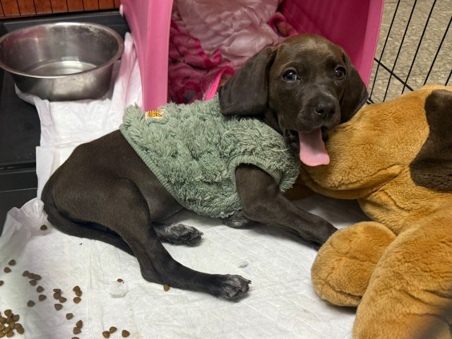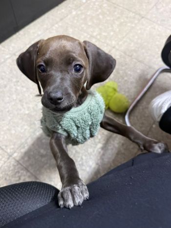 Joy - wurde in einem Garten gefunden, sehr abgemagert, mit Verletzungen unten an den Pfoten und einer Hautinfektion. Heute ist sie ein gesunder und munterer Welpe. Die kleine Joy darf mit unserer Tierschützerin jeden Tag ins Büro und lebt auch bei ihr.