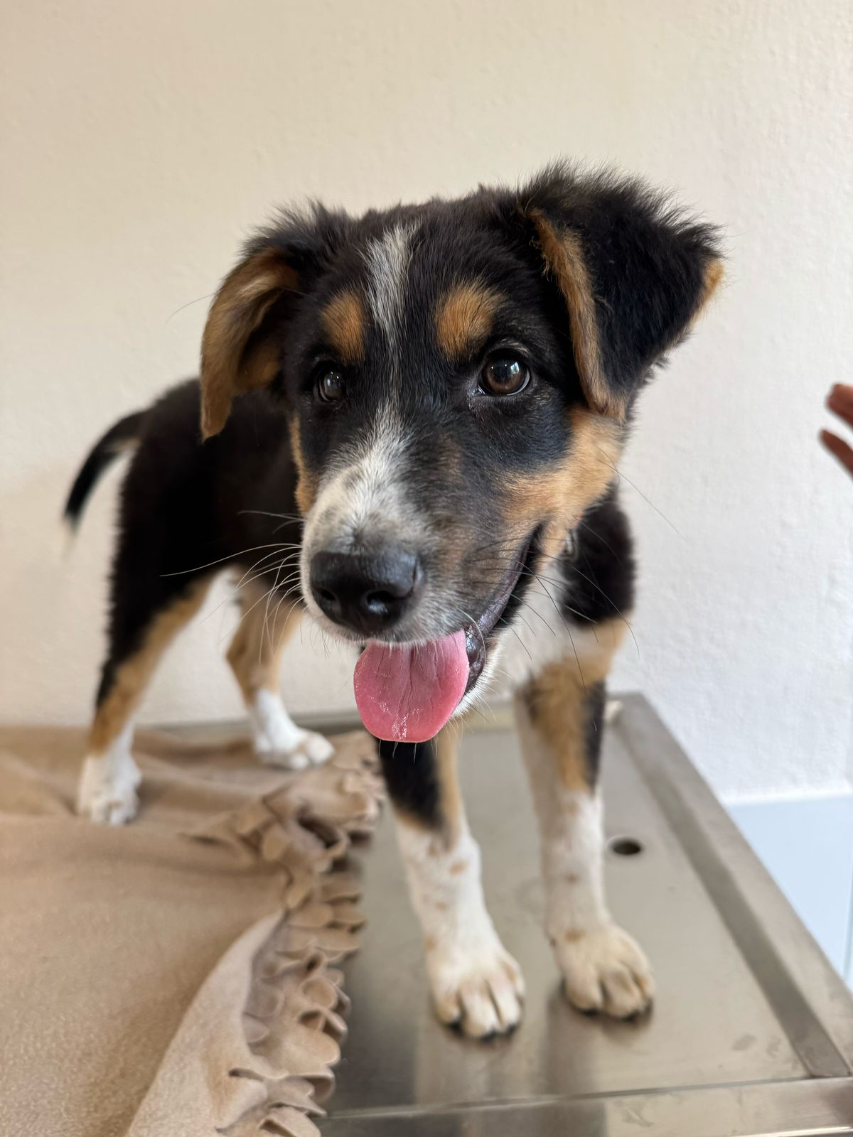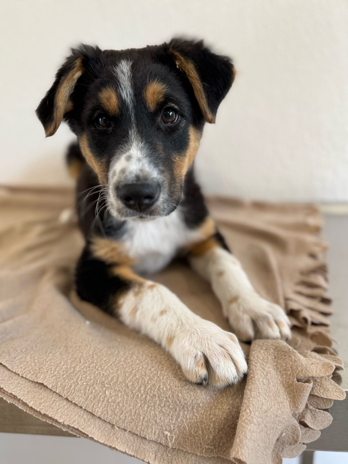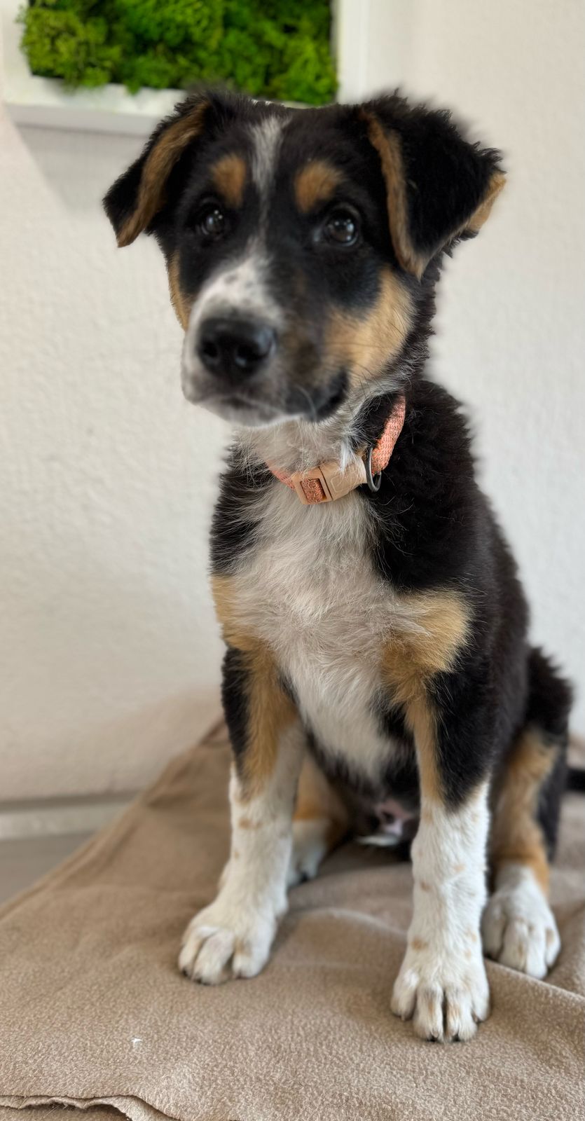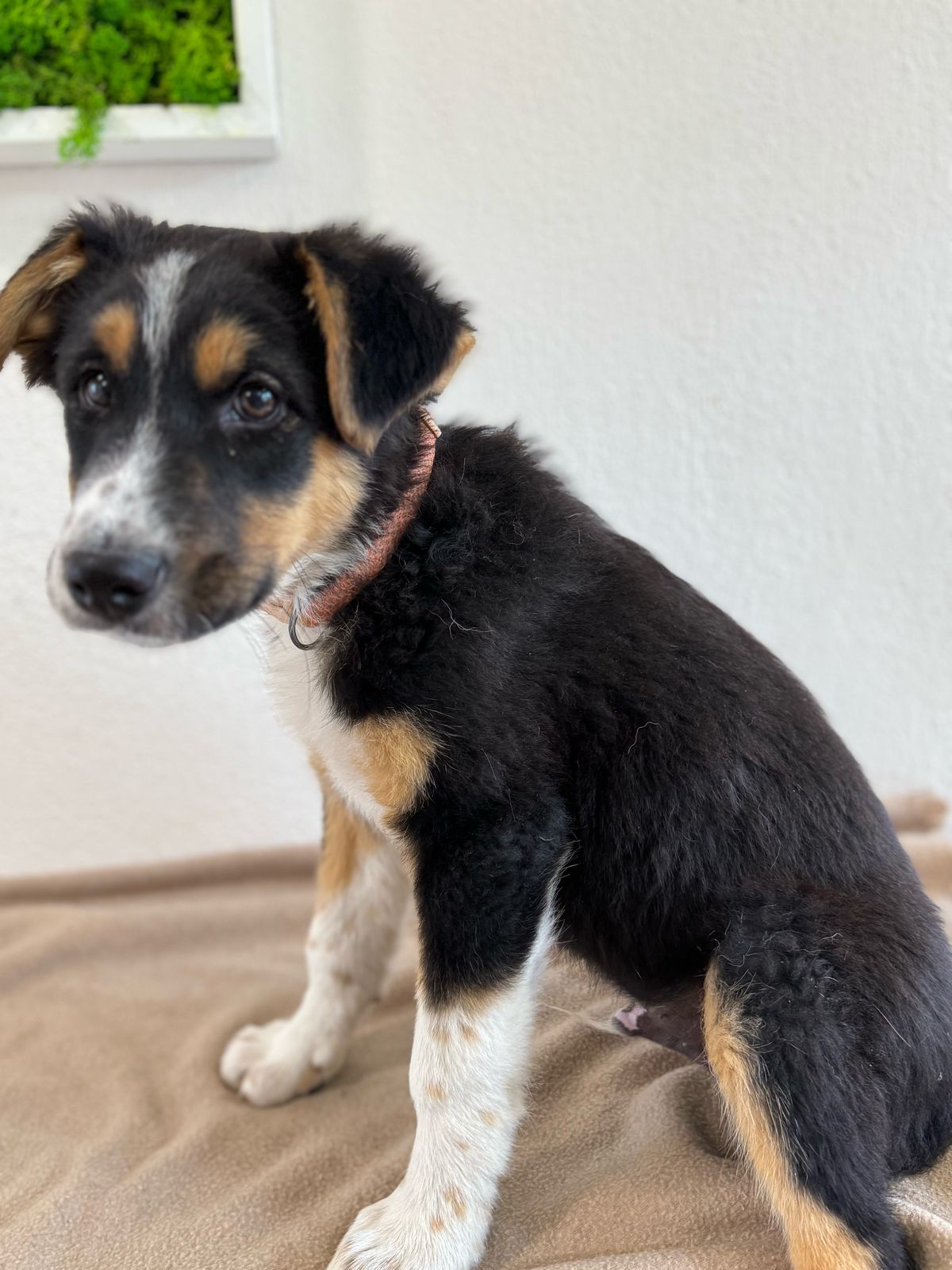 Er ist freundlich und fröhlich und hat mit seinen 3 Farben eine besonders hübsche Zeichnung. Er hat einen lebhaften Charakter und hat schon eine Menge gelernt in seiner Pflegestelle.