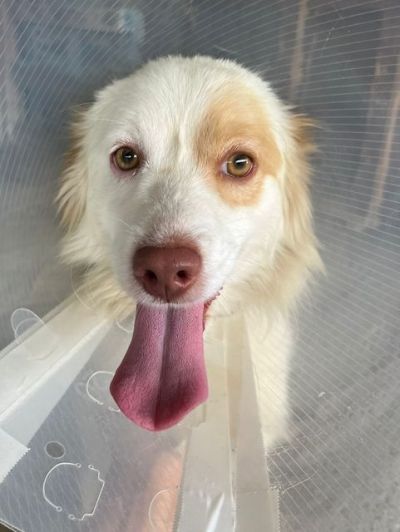 Rufus ist gerade kastriert worden, deshlab sein Schutzkragen auf den Fotos.