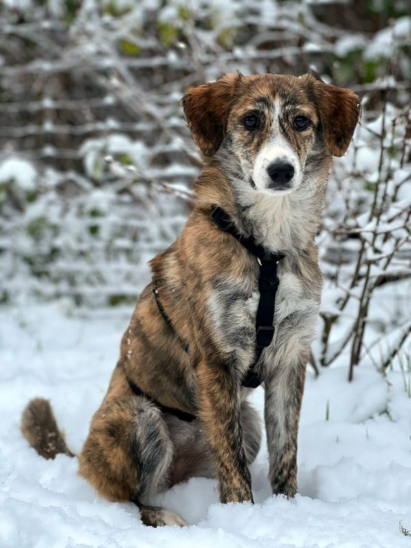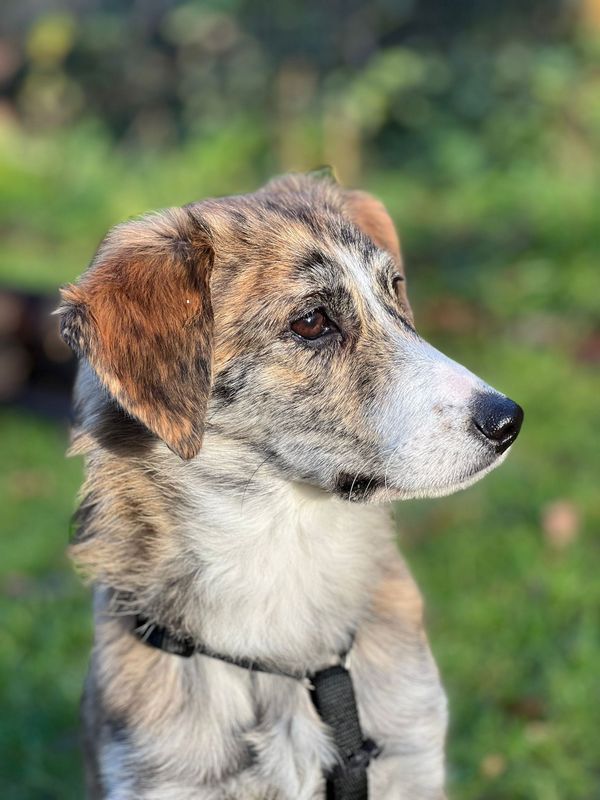 Sarena, bildhübscher bunter Hund wartet in Heidgraben