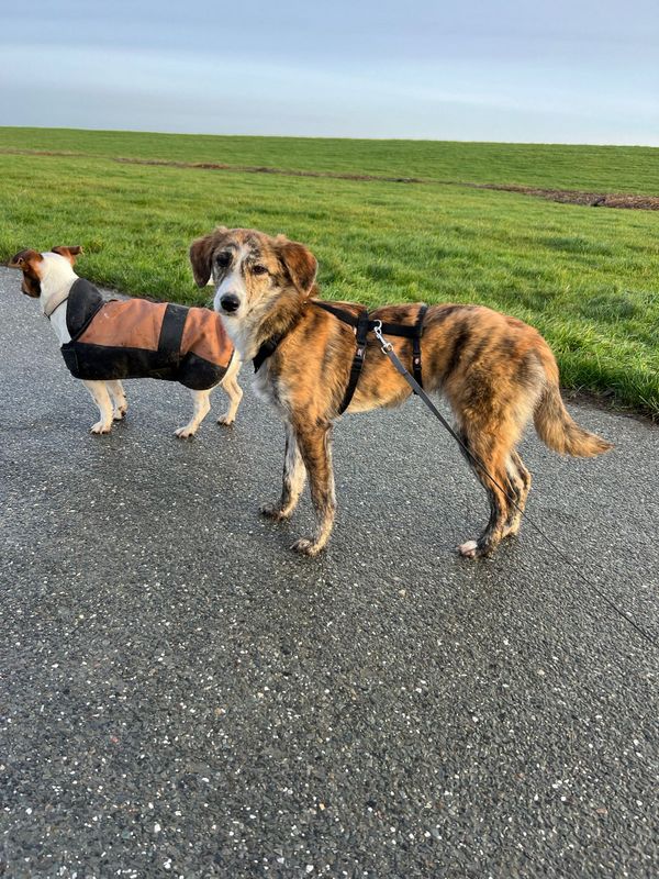 Sie ist gut über Stimme zu belohnen. Einen Jagdtrieb zeigt sie noch gar nicht, Hühner und Kleintiere sind ihr egal. Bei guter Führung läuft sie schon gut an der Leine.