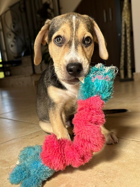 Für einen Welpen in dem Alter ist Snoopy nicht anstrengend im Umgang. Er schläft gerne bei ihr im Arm ein, oder kann sich auch mal mit Spielzeug alleine beschäftigen.