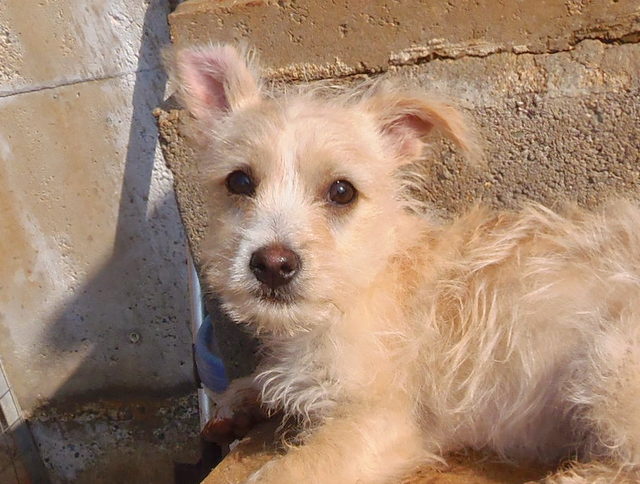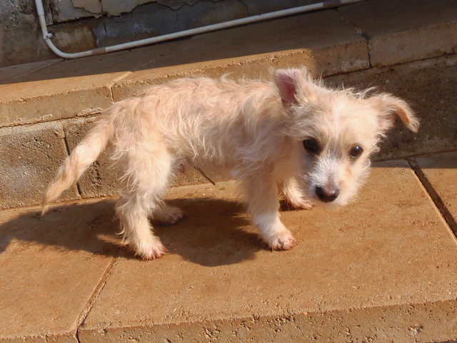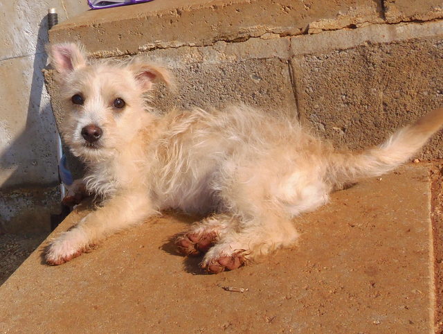 Tiger hat ein hübsches wollweißes strubbeliges Haarkleid, welches auch gerne regelmäßig gebürstet und gepflegt werden sollte.