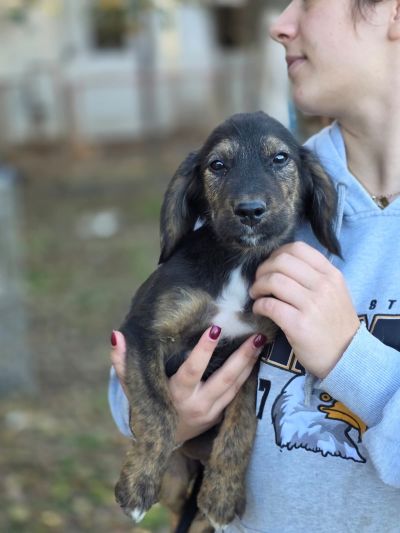 Er ist ein sehr unauffälliger kleiner Welpe mit den süßesten langen Ohren.
