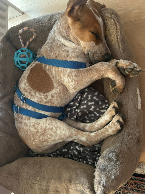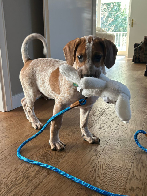 Typisch Welpe muss er das Hunde-1x1 noch lernen, insbesondere im Haus zur Ruhe zu kommen. Hier braucht er noch liebevolle Unterstützung und klare Orientierung.